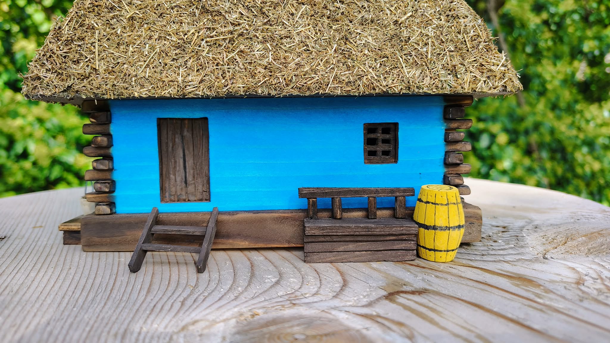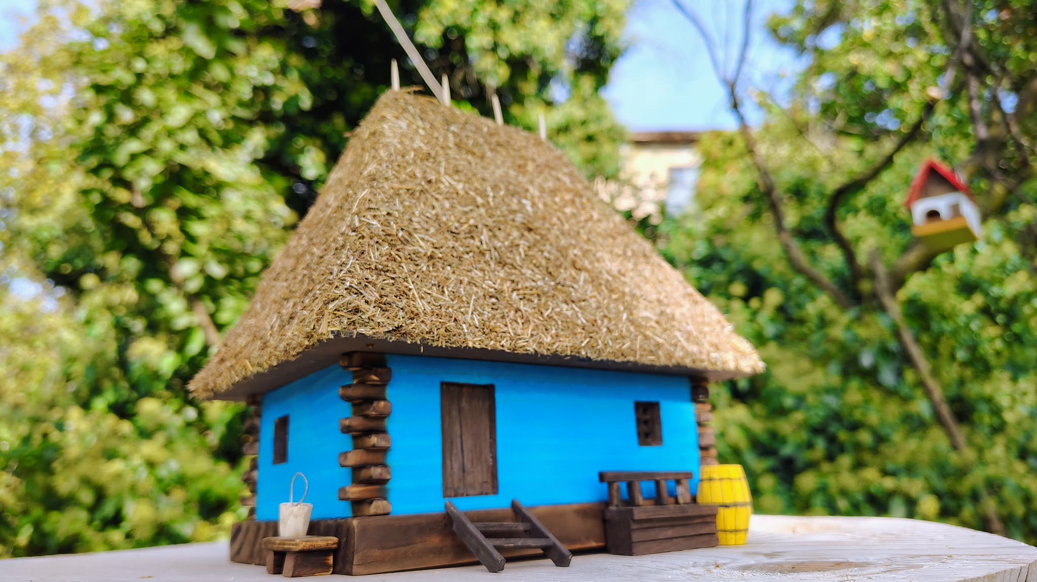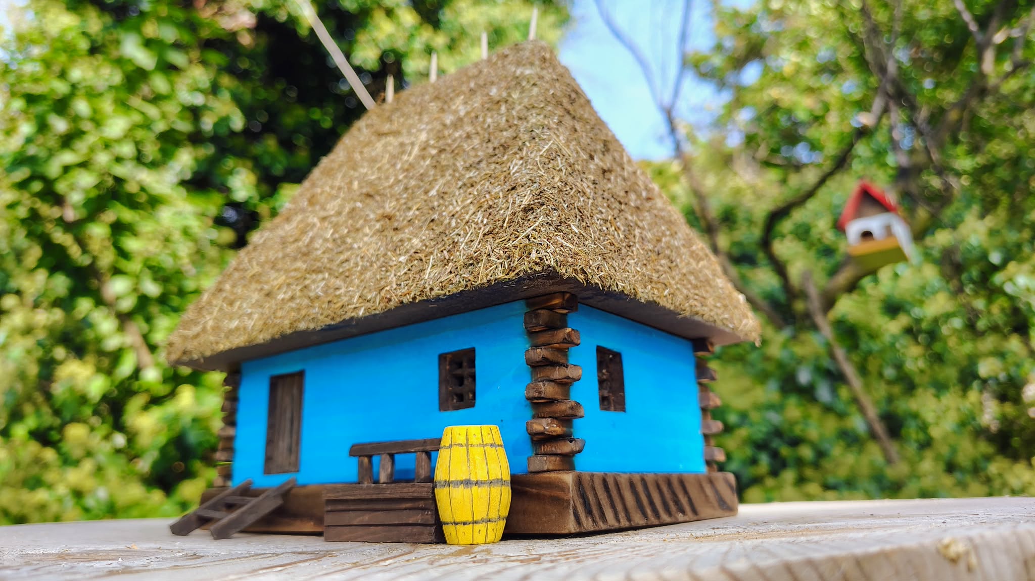 Această căsuță tradițională în miniatură este o lucrare realizată manual din lemn, inspirată din arhitectura rurală autentică a județului Sălaj. Acoperișul din paie, îmbinat cu grijă, pereții colorați în albastru specific zonei și detaliile atent lucrate – prispa, băncuța, scara, butoiul și micile accesorii – redau atmosfera caldă a gospodăriilor de odinioară.