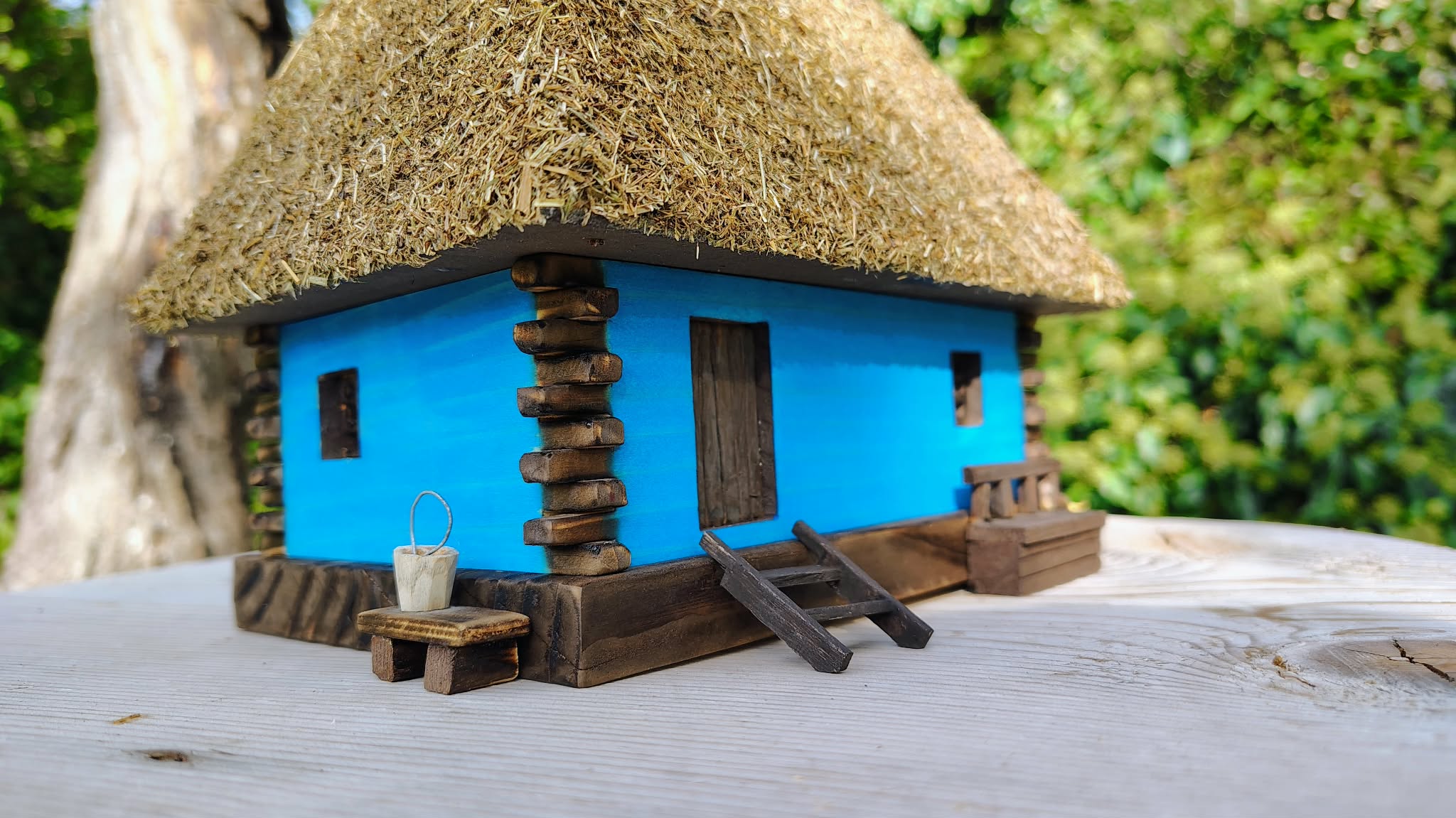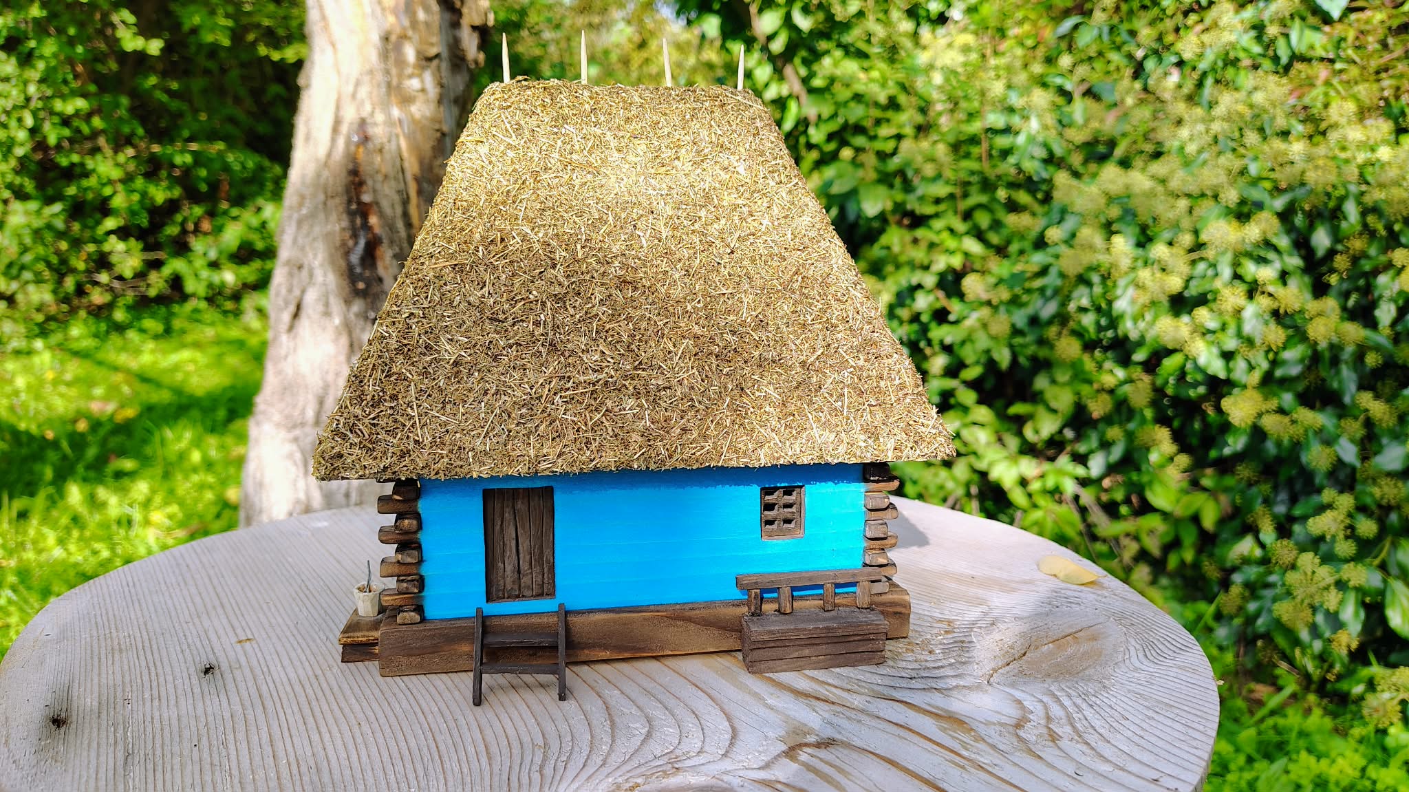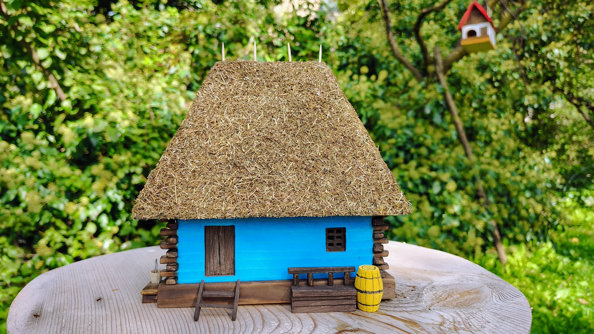 Această căsuță tradițională în miniatură este o lucrare realizată manual din lemn, inspirată din arhitectura rurală autentică a județului Sălaj. Acoperișul din paie, îmbinat cu grijă, pereții colorați în albastru specific zonei și detaliile atent lucrate – prispa, băncuța, scara, butoiul și micile accesorii – redau atmosfera caldă a gospodăriilor de odinioară.